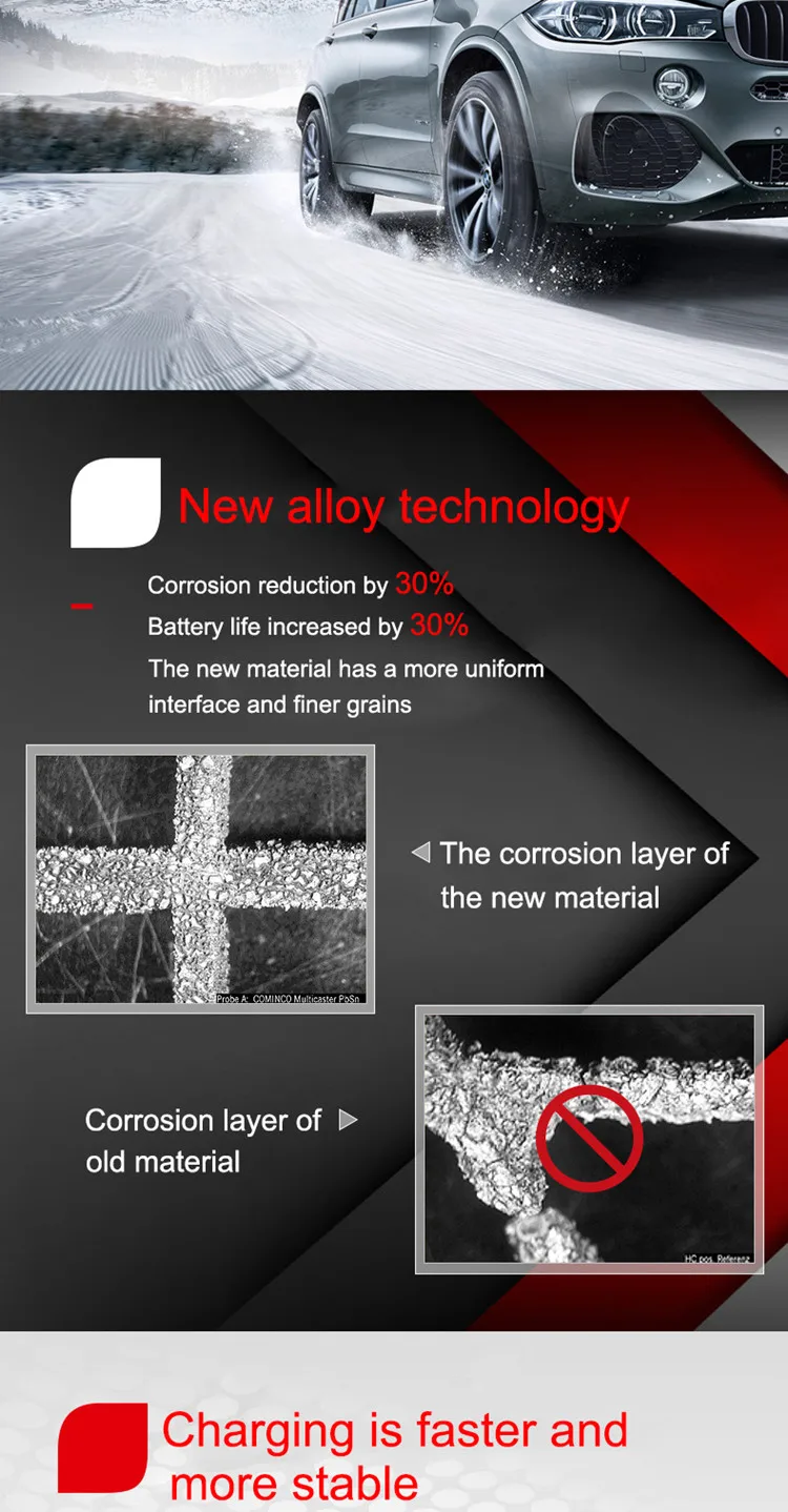 The Pb-Sb-Ca alloy grid offers more excellent characteristics of oxidation resistance, corrosion resistance and less water loss than the general Sb alloy grid, which can minimize the self-discharge and maintain its good starting performance even after long-term storage.