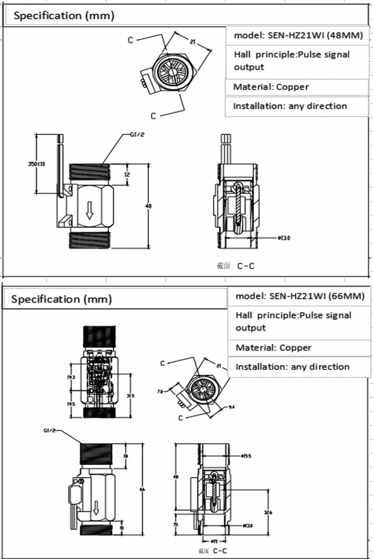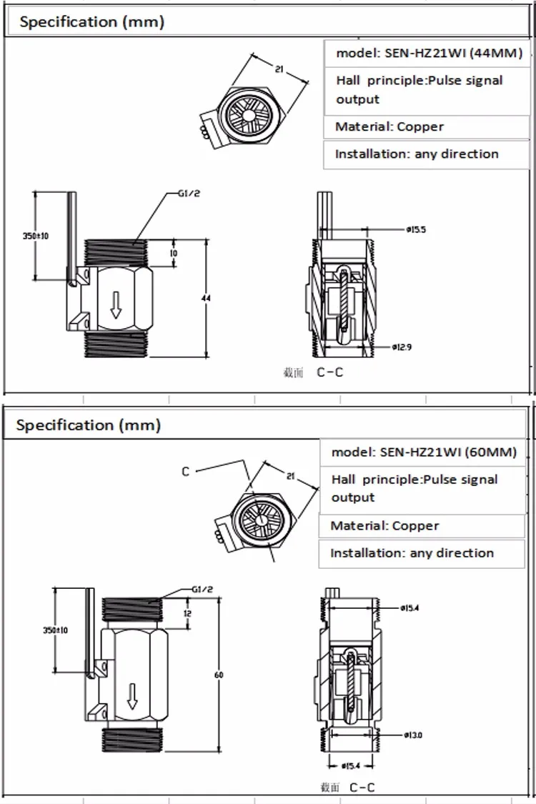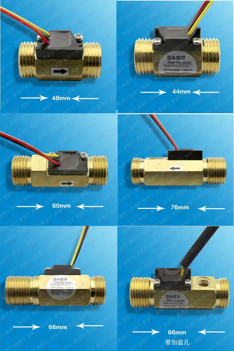 SEN-HZ21WI flow sensor,G1/2 extenal tooth, one type,size:26.5*60mm, intenal tooth into the water ,extenal tooth out the water ,Waterproof explosion-proof, heat and cold resistance.can be used as a water switch, but also can be used to measure flow, accurate measurement, water flow sensor special use electric water faucet,shower room credit card system, water control machine meter water,water heater,wall hung dedicated.we have two series.If you want to increase the temperature control ,you can add heat sensitive resistor, the output line is green, but also can be connected to the other two special line to control temperature.