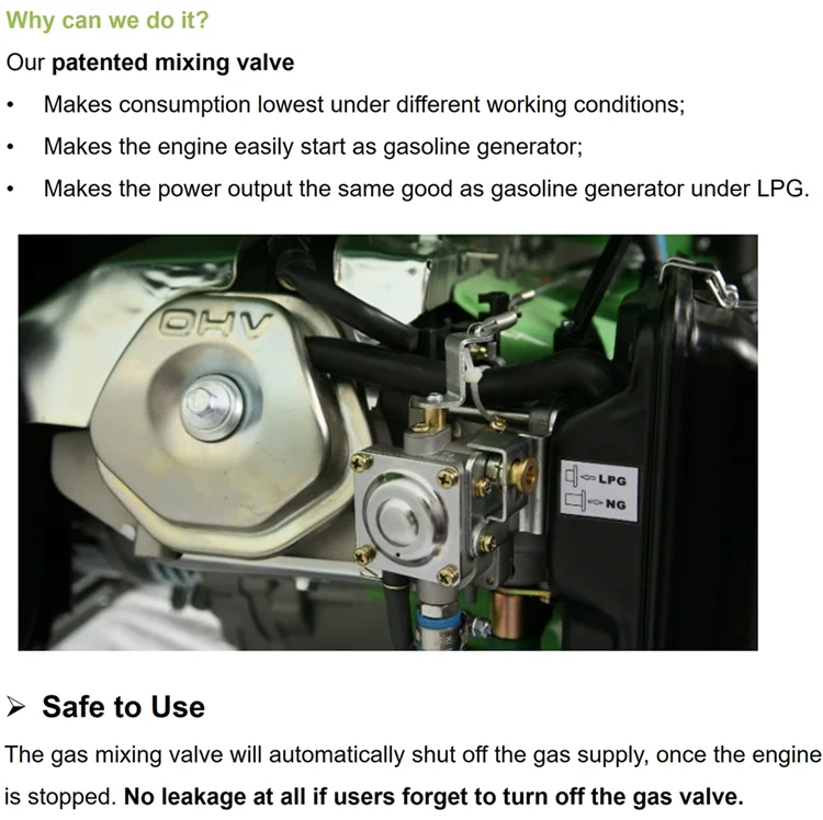 8, Easy use of NG and LPG generator compare with gasoline generator, just need to open the gas valve. |