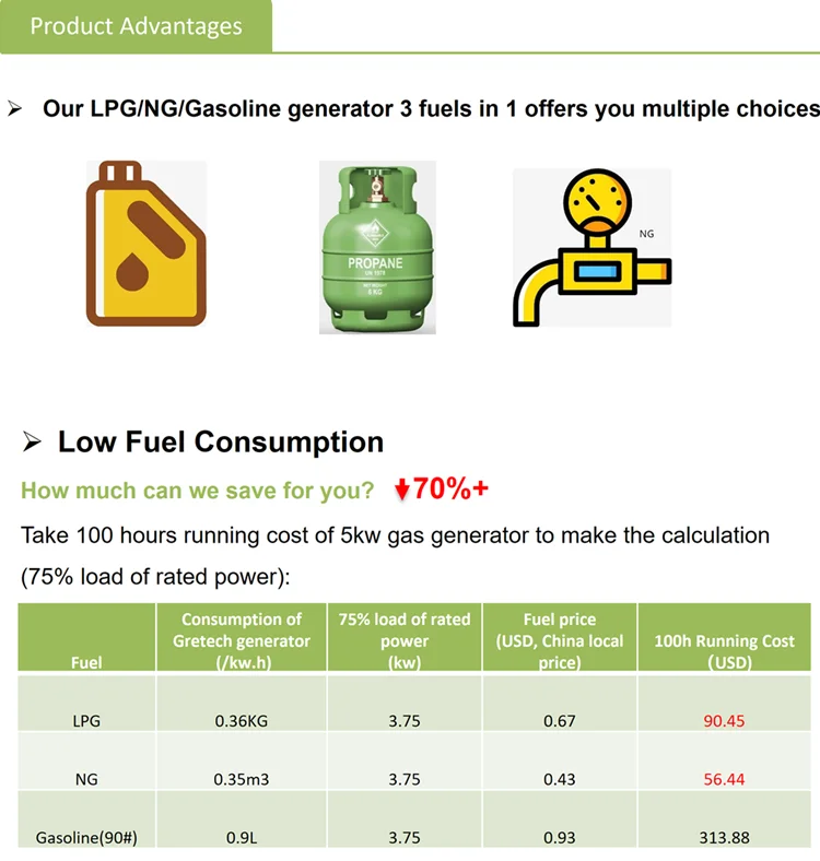 6, Gasoline generators continuous working time is fixed due to the fuel tank size. But NG supply can last any long time which enable the generator run longer time. While bigger tank of LPG can have machine run longer time. |