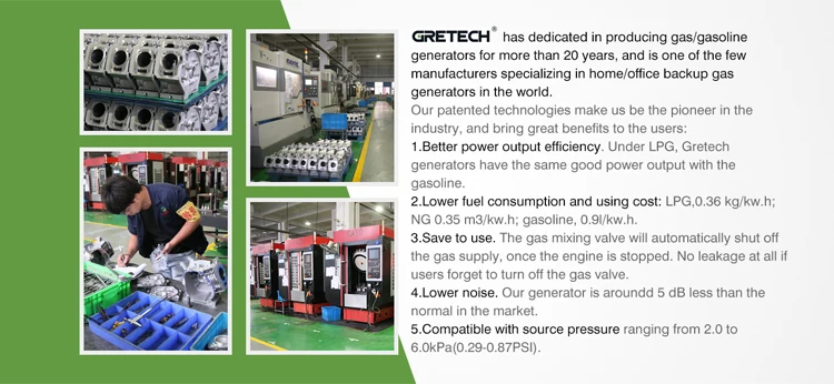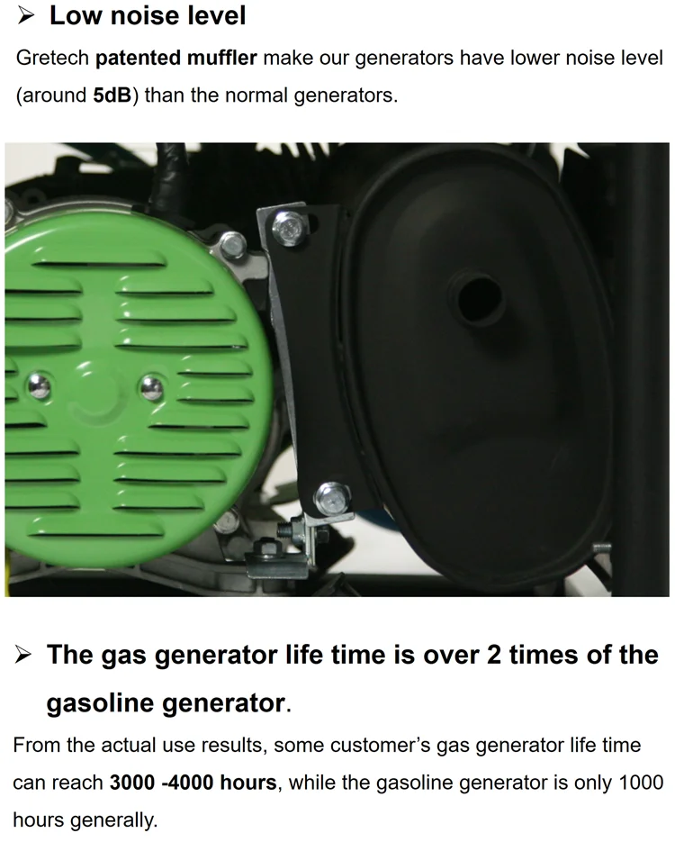 7, Gretech Power’s muffler is own designed, that is around 5 db less than the normal muffler, which can be used for both gasoline generator and also 3 in 1 or gas generators. |