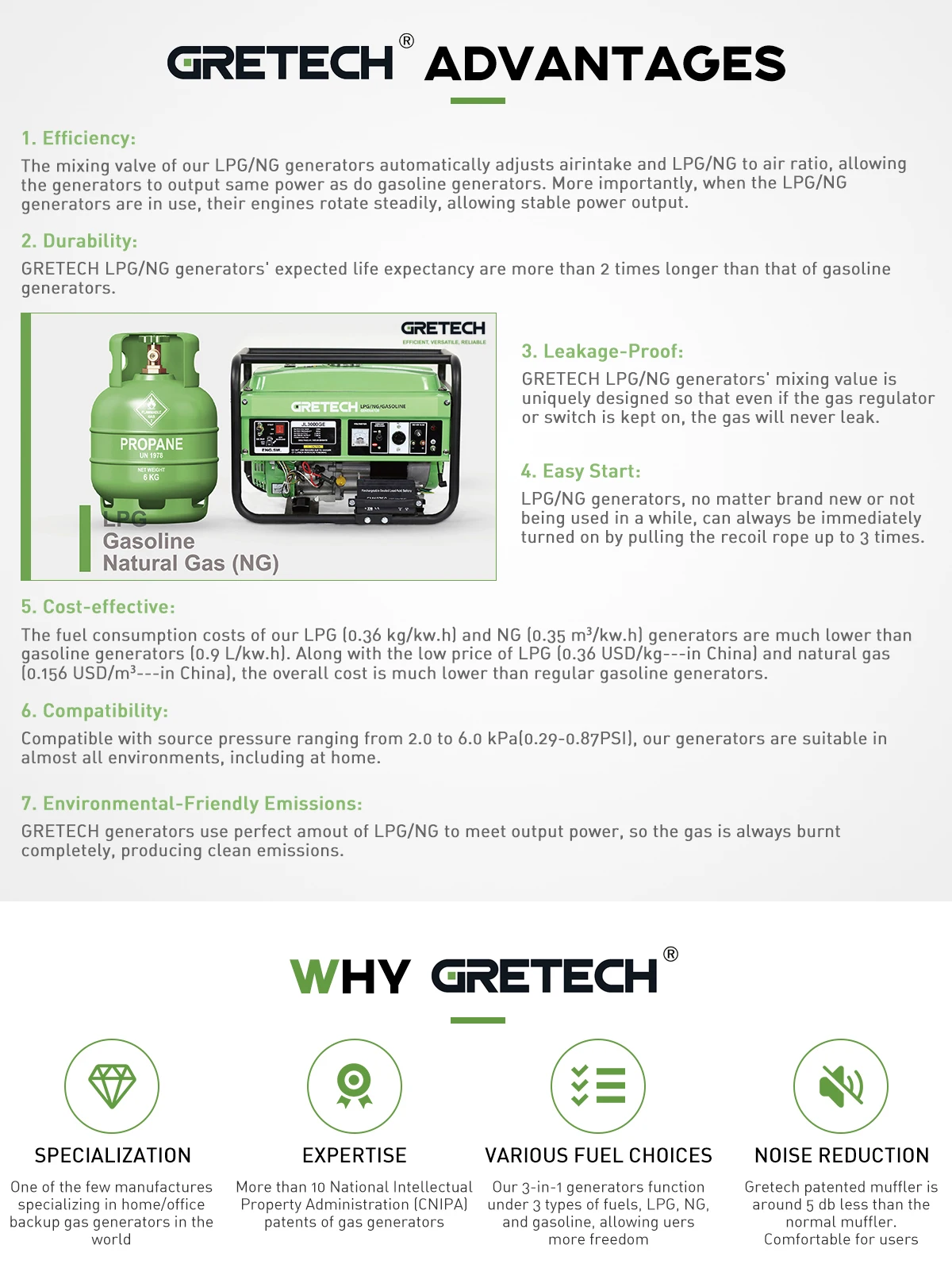 | rated power(LPG/GASOLINE): | 6000w, 6500w; | Brand Name: | Gretech; |