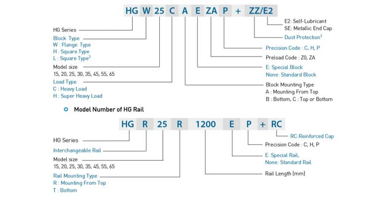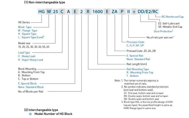 .HG series guide rails can be divided into non-interchangeable type and interchangeable type. Same size. The only difference between the two types is that the interchangeable types of sliders and guides can be freely replaced, and their accuracy can reach p-class. The models of HG series include size, type, accuracy grade, preload grade, etc.