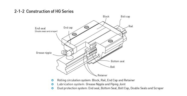 Due to precise dimensional control, the dimensional tolerances of the HG series can be kept within a reasonable range, which means that any block and any rail of a specific series can be used together while maintaining the dimensional tolerance. And a retainer was added to prevent the balls from falling out when removing the block from the track.