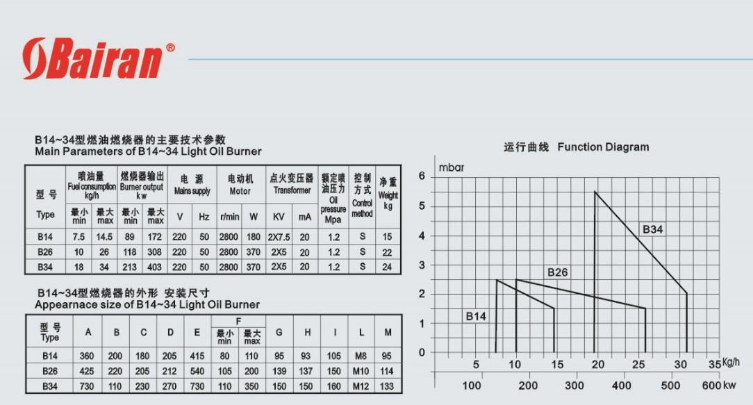 | product name: | Bairan B26 light oil burner, diesel burner, primary fire burner | Heat output: | 118-308kw |