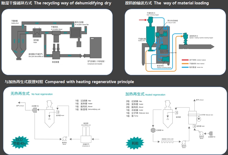 1. The high-performance hot air diffusion device with uniform hot air distribution is adopted to keep the plastic drying temperature uniform and improve the drying efficiency.