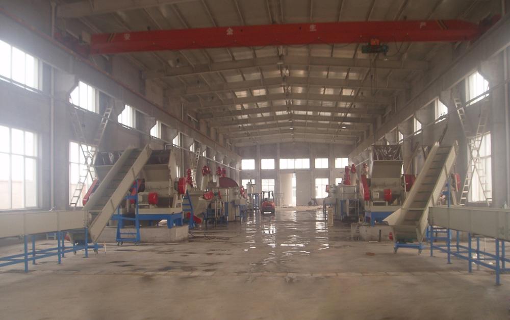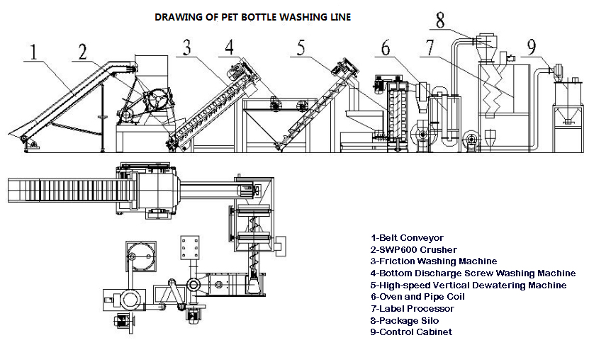 The production line includes: belt conveyor, label remover, sorting table, crusher, hot water steamer, screw feeder, high-speed friction cleaning machine, single/double screw cleaning machine, centrifugal dehydrator, cyclone hopper, electric control cabinet wait.