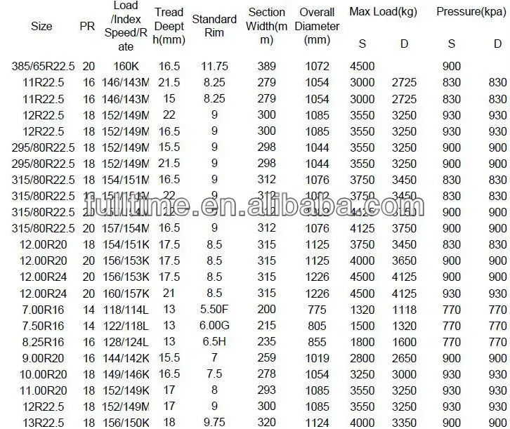 TBR:10.00R20,10R22.5, 11.00R20, 11R22.5, 11R24.5, 12.00R20, 12.00R24, 12R22.5,13R22.5,295/75R22.5,295/80R22.5,315/80R22.5 and so on.