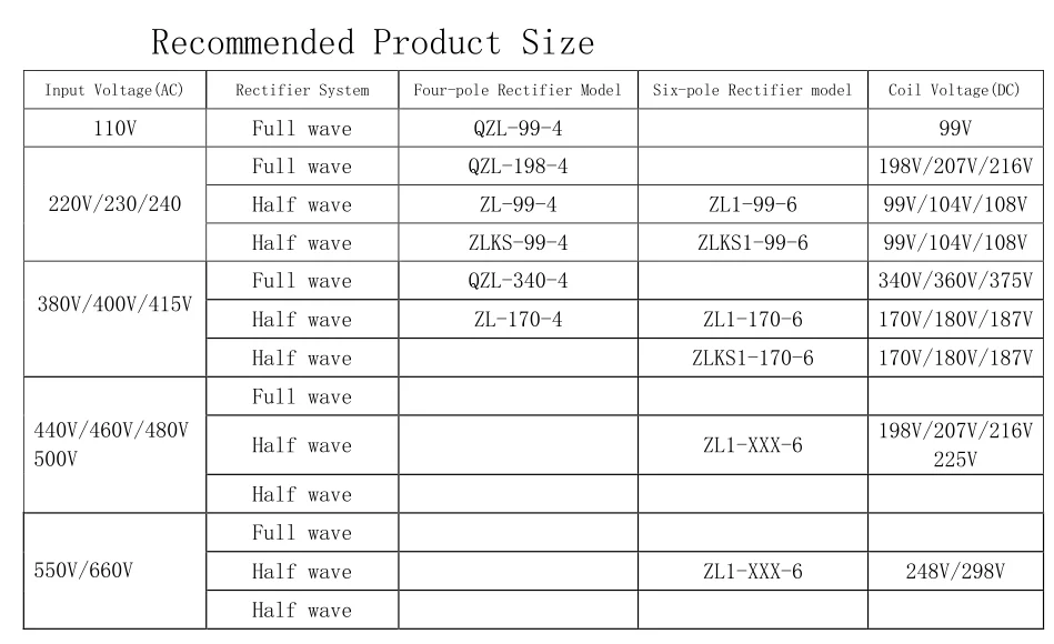 ZLk series rectifier power supply wiring from the form of Lead-and-two post; from the end brought the number of leads and have a four-terminal-side lead to six (six-end leads to facilitate contact with external contactors); from the speed of action There are fast-general and two (of which was divided into fast-rapid pull-in, quick release and pull-in is fast and quick release of three); from the input and output voltage, there 220V AC voltage input, 99V DC output voltage and 380V AC input voltage, 170V DC output voltage of two. This product can achieve output current 2A, to meet the basic kinds of electromagnetic brake and DC-DC electromagnetic clutch.