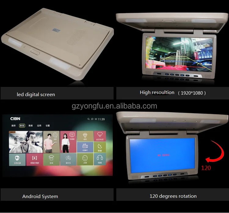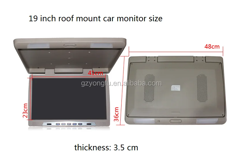 Material: PVC Type:roof lcd display Applicable model: Universal Power:DC12V Screen type: 16:9 Screen size: 19 inch Color: rice. Grey. Black. Weight: 4.2 (Kg) Bandwidth: 60 (MHz) Resolution: 1440*900 Compatibility: good Input signal: two way video input Picture tube: TFT LCD TV system: PAL/NTSC Support :remote control |