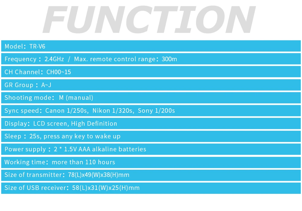 | Compatible Brand: | Canon,Fujitsu,Nikon,Sony, Minolta; | Product name: | TR-V6 2.4G Wireless Bluetooth Intelligence Flash Trigger Transmitter; |