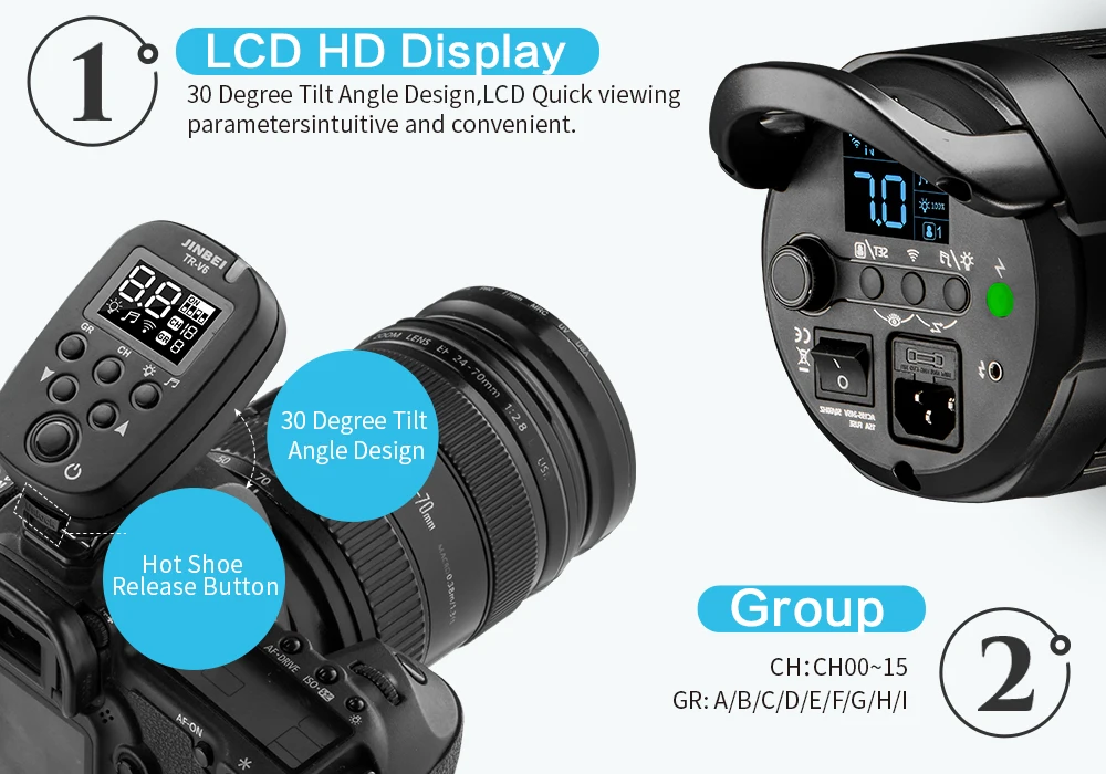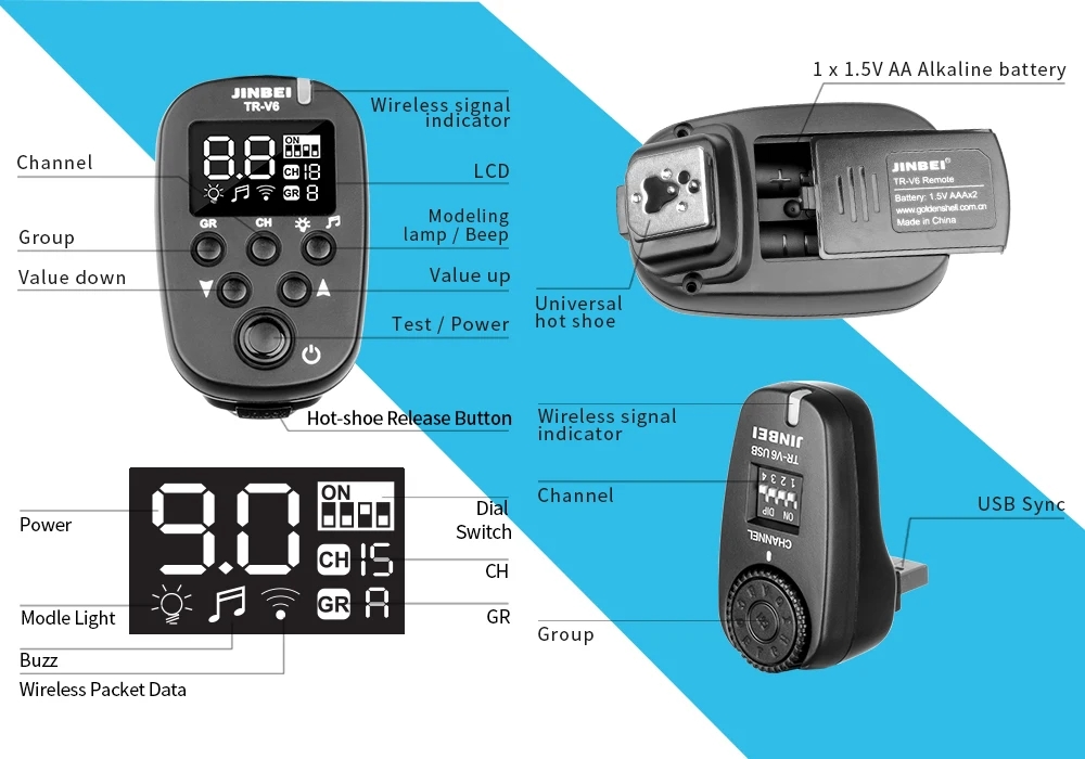 | Channel: | 0-15/16 channels; | Packaging Detail: | JINBEI TR-V6 2.4G Wireless Bluetooth Intelligence Flash Trigger Transmitter with 16 Channels/10 Groups/Photo Studio Photography; |