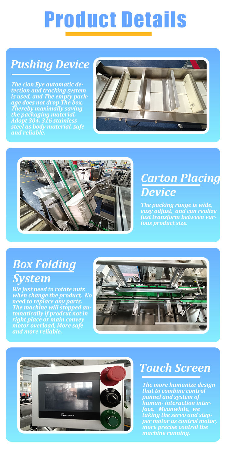 | Packing speed: | 30-250 boxes/min | Material: | Stainless steel |