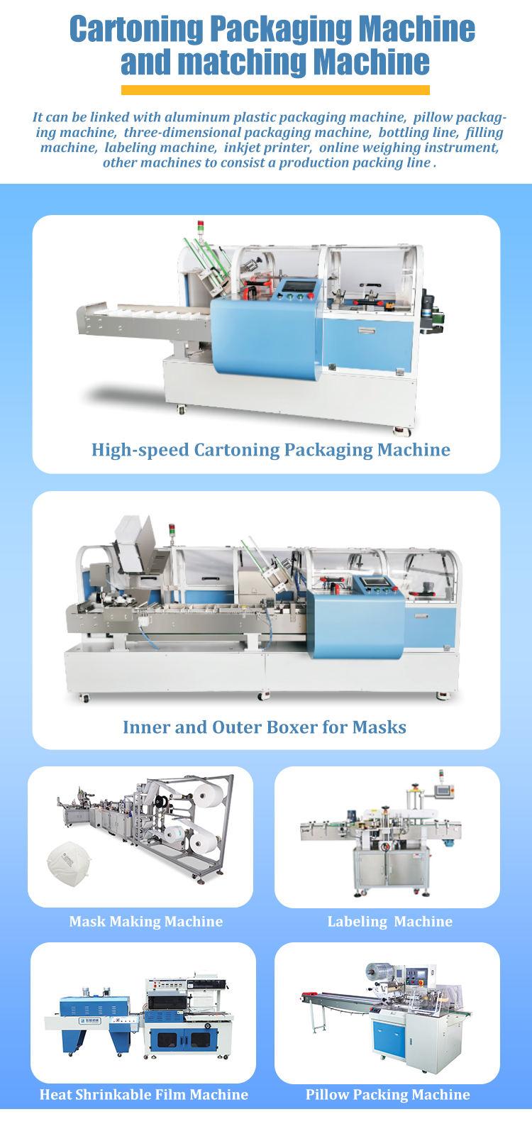 | product name: | High speed cartoning machine | Core components: | Bearings, motors, pumps, gears, PLCs, others, pressure vessels, engines, gearboxes |