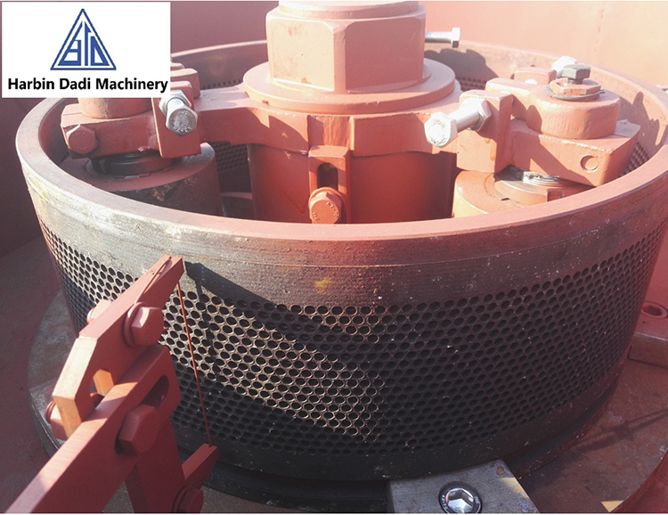 The raw material enters the working chamber and falls on the "discharging tray", and the raw material is thrown into the ring die under the action of centrifugal force; the ring die and roller system are driven by reduction gears and transmission devices, and the energy comes from the motor. The pressure comes from the operation of the ring die and the roller system, and the cylinder is forced to be extruded from the hole of the ring die, and cut into the required small particles by the cutting line.