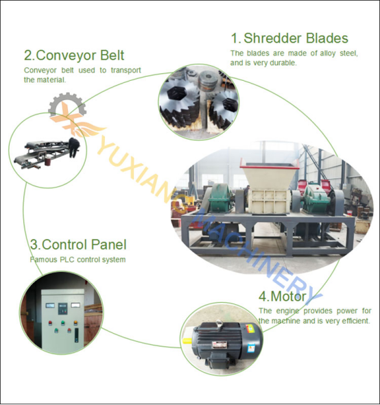 All small metal shredders adopt PLC automatic control system, with automatic reverse control system in case of overload. The shredder is easy to disassemble and replace, and is suitable for shredding large, thick and hard materials. |