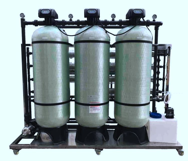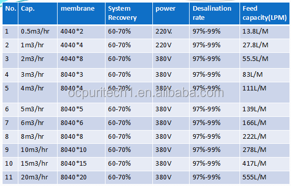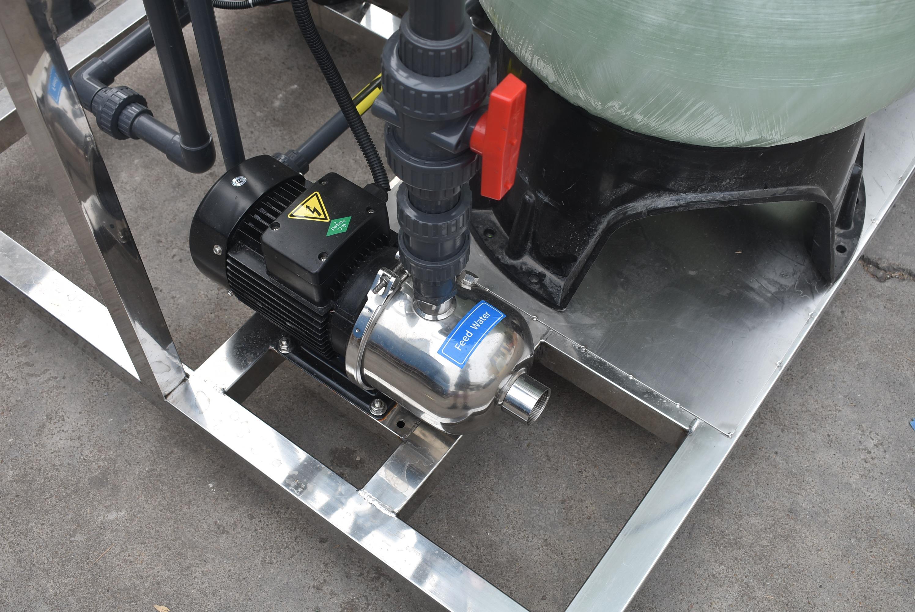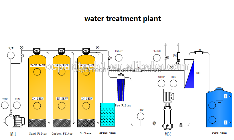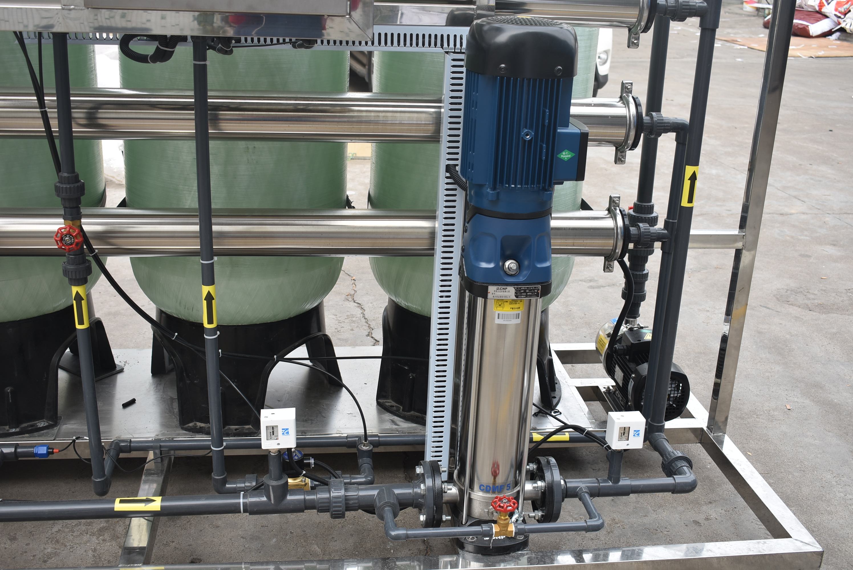 Workflow: Raw water pump → sand filter → activated carbon filter → water softener→Security filter → high pressure pump → RO component → UV sterilizer→purified water
