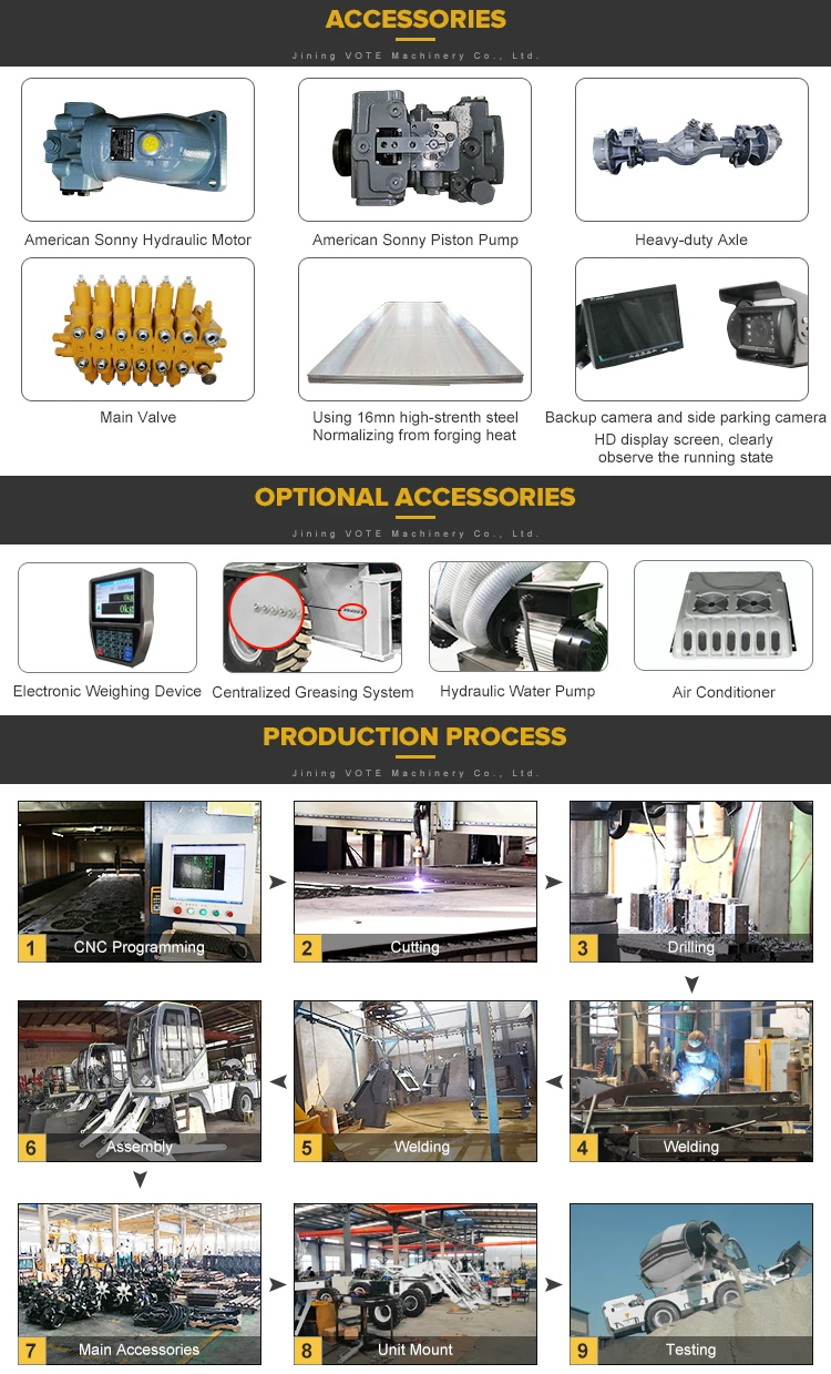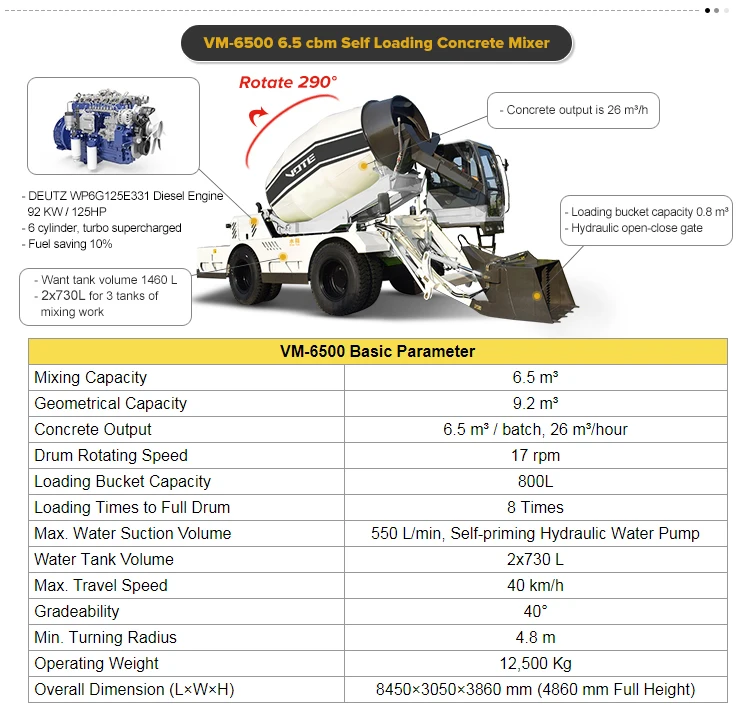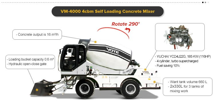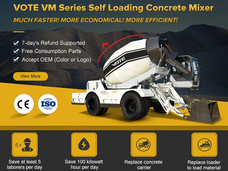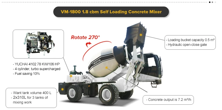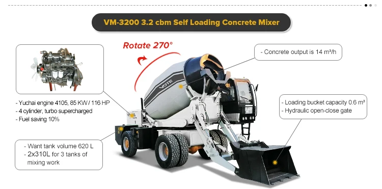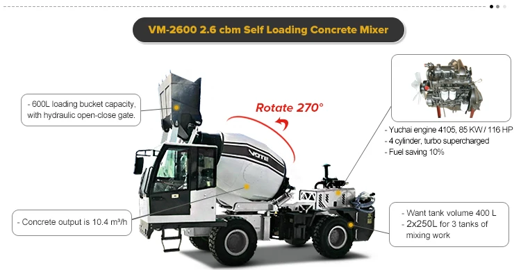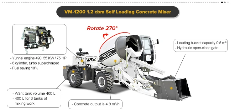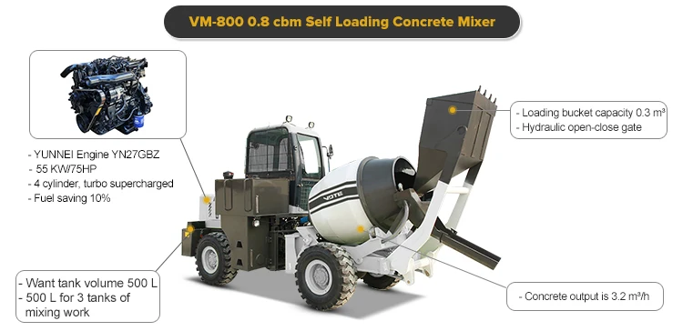 1. VOTE VM Series Self Loading Concrete Mixer Truck is a kind of unique vehicle which combines concrete mixer, transit mixer and wheel loader.