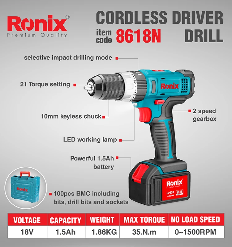 Ronix 18V Cordless Impact Drill Screwdriver Drill Model 8618N: