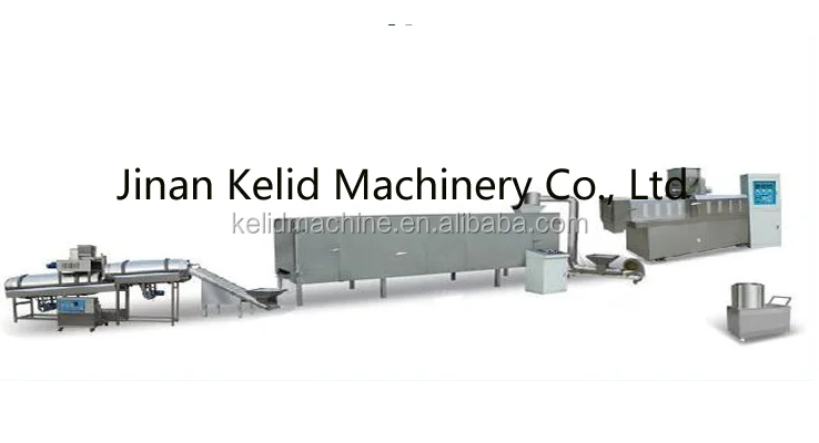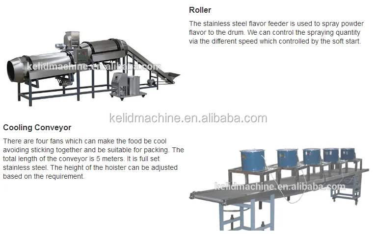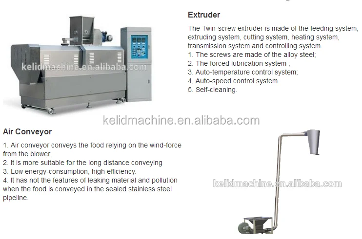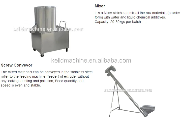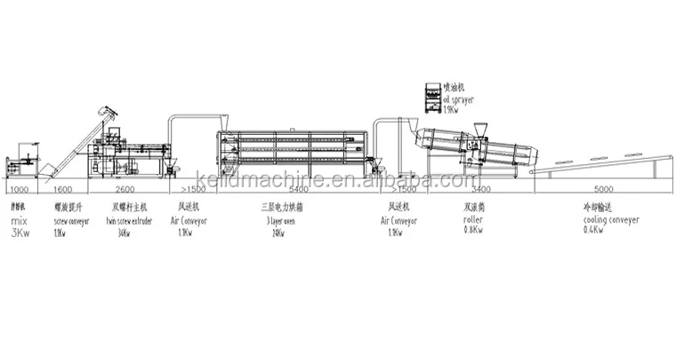 Mixer- Screw conveyor- Extruder- Air conveyor- Dryer- Air conveyor- Flavoring- Cooling Conveyor