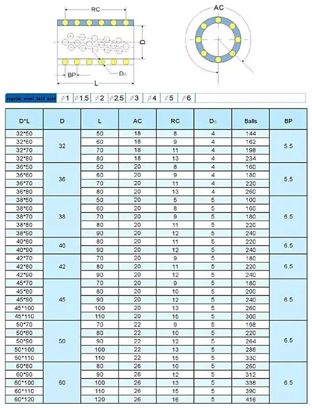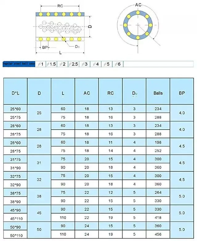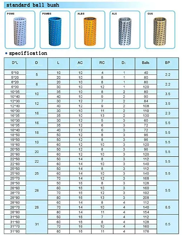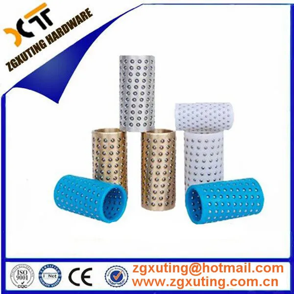 Different Ball bushing : plastic steel ball bushing, aluminum alloy steel ball bushing, copper based steel ball bushing, plastic base, plastic sets, aluminum sets, copper base, copper sets can be divided into steel ball copper sleeve, aluminum sets, plastic sets. SUJ2 bearing steel ball of 0.25μ m steel heat treatment hardness of 62~67HRC steel bushing because of its special purpose production process is: in the production process using a lock bead process, can prevent the ball off