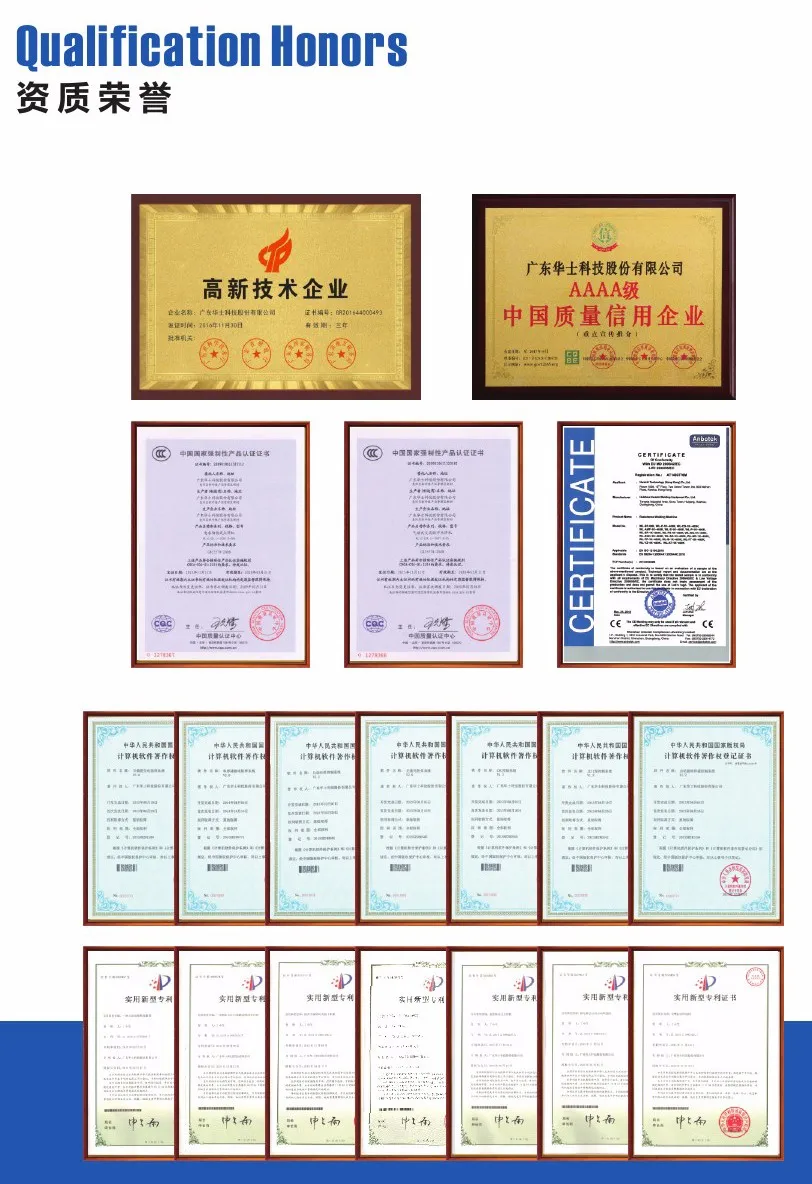 In the past 20 years, Hwashi has obtained more than 50 patents for invention patents, utility model patents, design patents, and software Copyrights. It is the drafting unit of several national standards and industry standards. Hwashi has been awarded "China famous brand", "Guangdong famous brand", "China quality credit enterprise", "world outstanding Chinese businessman association member unit", "Guangdong province science and technology innovation quality management advanced unit", "Guangdong province academician expert enterprise workstation" and many other honorary titles.