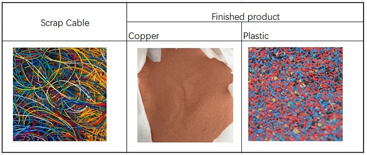 Scrap cable-----Copper wire crusher---------------Separator----Finished plastic