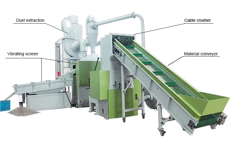 This type copper wire recycling machine includes waste wire crushing and separating copper granule from plastic powder. This scrap copper wire recycling plant adopts advanced design, rational structure and reliable operation. It includes scrap copper wire crusher, vibrating screen, feeding blower and dust extraction. This copper cable recycling machines can process verious scrap cable. This model machine adopt special design of vibrating system which increase waste recycling machines service life. Air inner circulation system which means separating air and dedust air inner circulation and no exhaust. The capacity of process scrap cable is around 400--500kg/h.