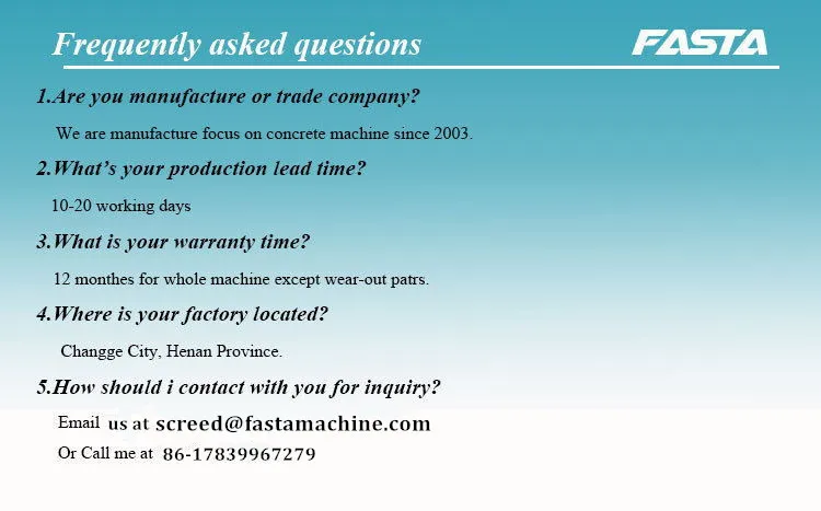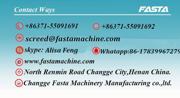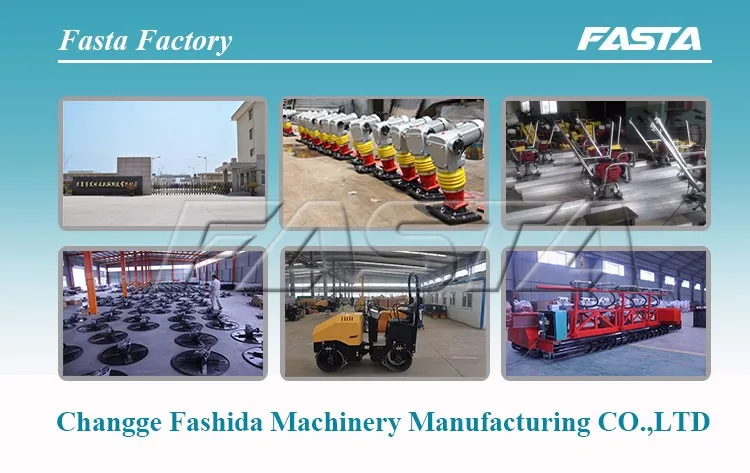 Changge Fasta machinery manufacturing CO.,LTD is a professional company produce all kinds of concrete road construction machines and other concrete machines. We have manufactured road rollers, vibratory screed, power trowel, concrete roller paver, concrete saw, asphalt saw cutting machine, plate compactors, tamping rammer and concrete row vibrators since 2003. Our machines have been widely used not only in China but also in other countries such as Russia, India, Vietnam, Indonesia, Australia, South Africa and so on.