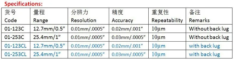 | Range: | 0-12.7mm/.5"; | Accuracy: | 0.02mm/.001"; |