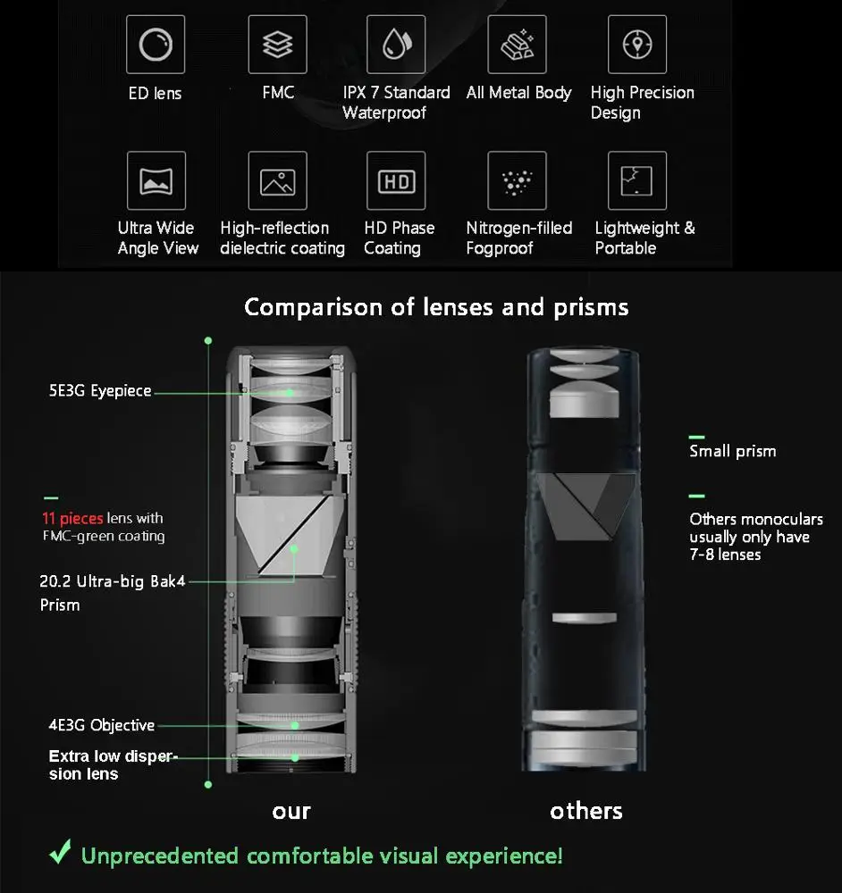 5) Bak-4 Prism quality lens provides outstanding image quality, gives you brilliant visual experience.