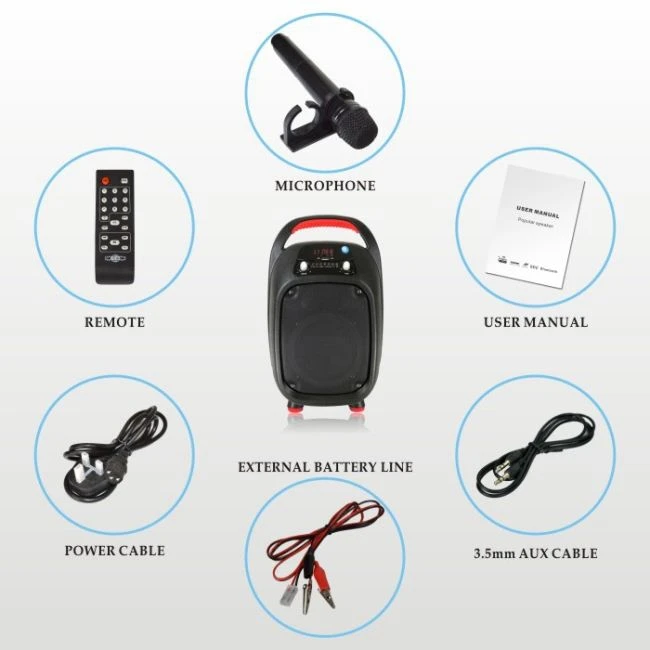 | Single package size: | 28.3X26.7X45.7 cm; | Function: | bluetooth/USB/SD/Radion/Wireless Mic/Remote Control; |