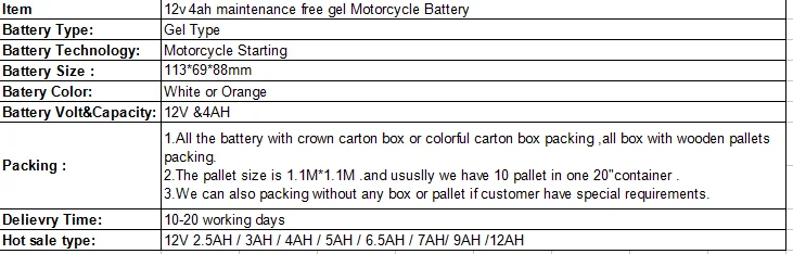 | Name: | Hot sale motorcycle 12v 4ah battery with gel full capacity; | Color: | White or Orange; |