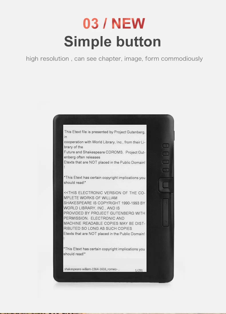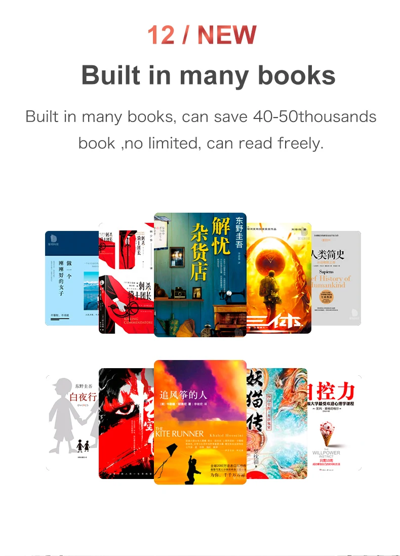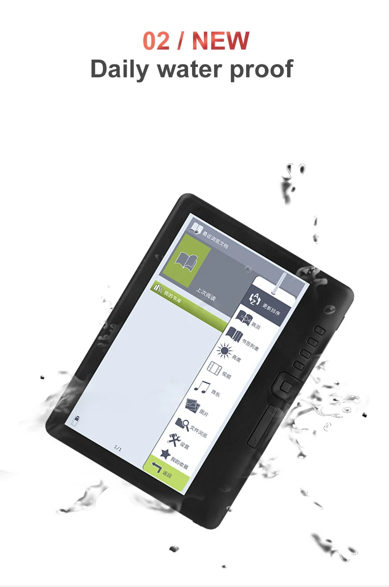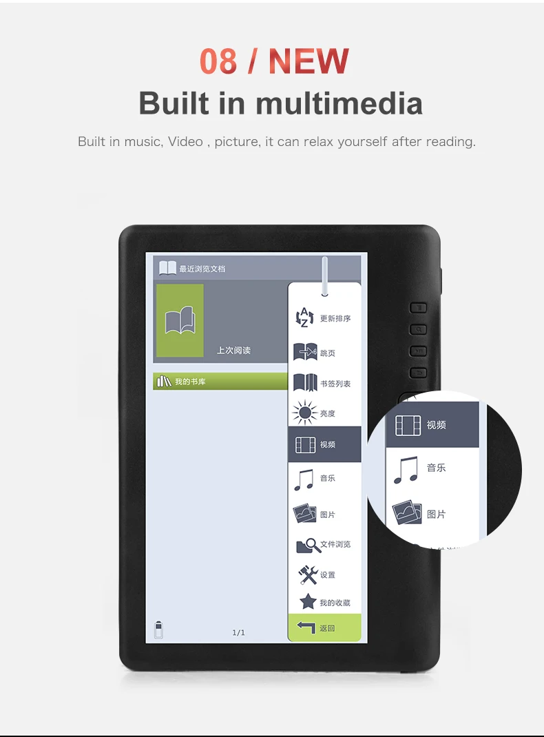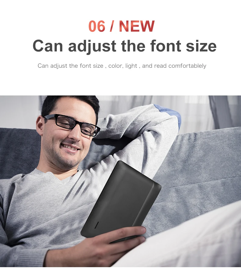| Support Type: | CHM,DOCX,DjVu,EPUB,FB2,HEB,HTM,HTXT,MOBI,PDB,RTF,UMD,XLS,Html,Hwp,PPT,Prc,TXT,DOC,PDF; | Built in storage: 8G: | Extended storage: TF Card (max 32GB); |