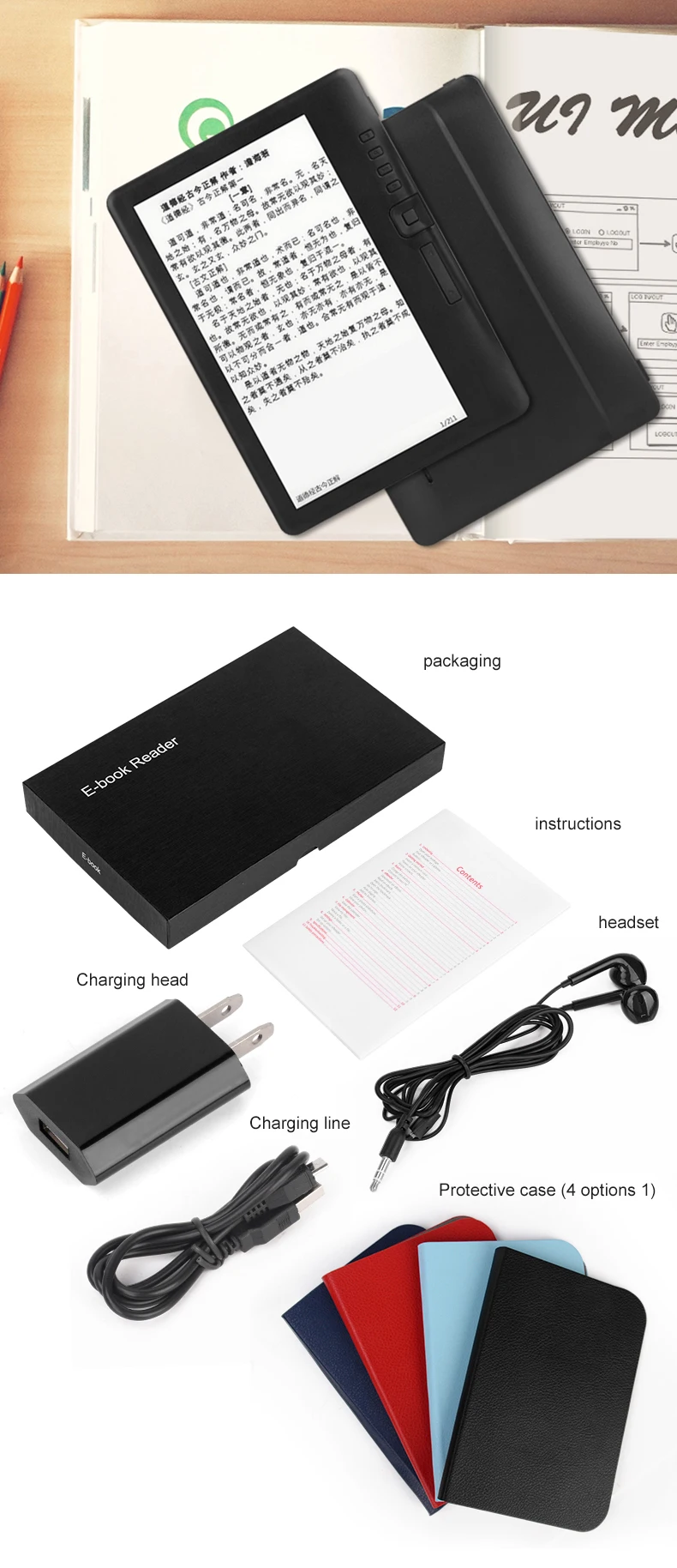 ebook reader x1, user manual X1, USB charger x1, protect shellx1