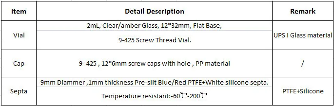 | Packaging Detail: | 100pcs vials/ pack unit (Pack by PP box with shrink-wrapped). The PP caps & Septa with pack by PE bag.; | Size: | 12*32mm , 11.6*32mm; |