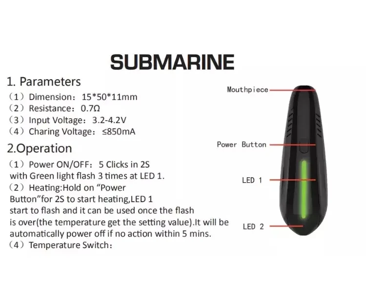 | Package Content | 1 x Submarine Kit 2 x Black Drip Tip 2 x Cotton Swabs 1 x Brush 1 x Dab Tool 1 x USB Cable 1 x User Manual |