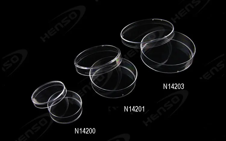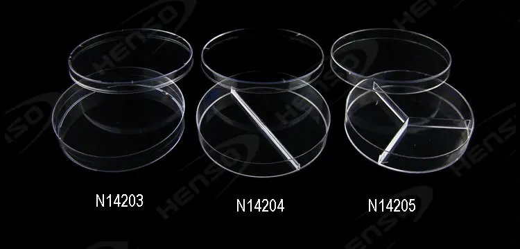 HENSO can supply all plastic petri dishes, including round 35mm, 55mm, 60mm, 65mm, 70mm, 90mm(1, 2, 3 sections), 150mm, and square 100mm, 130mm etc.