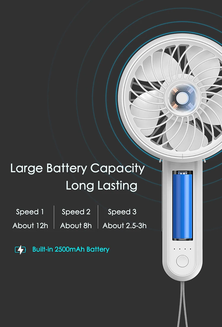 [ENERGY SOURCE]: This fan is a USB port rechargeable model. It can also be powered directly by batteries,USB cable can be charged with computer, mobile power, power bank and so on.