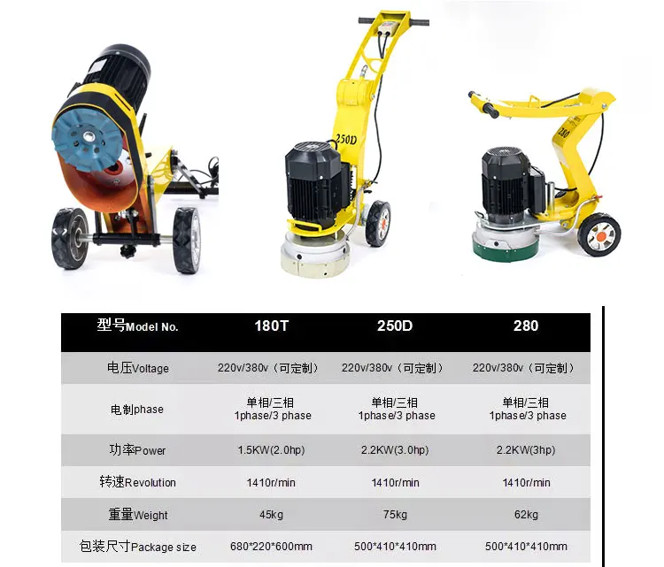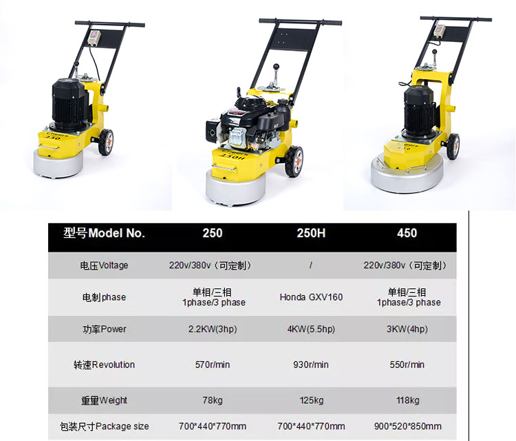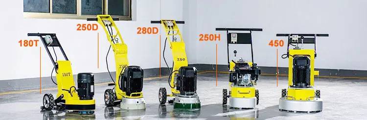 180T is specially designed for edging; 250D, 280 is suitable for small area grinding and auxiliary edging; 250 optional gasoline engine is an essential machine for outdoor grinding; 450 is suitable for small construction sites, proofing, etc.