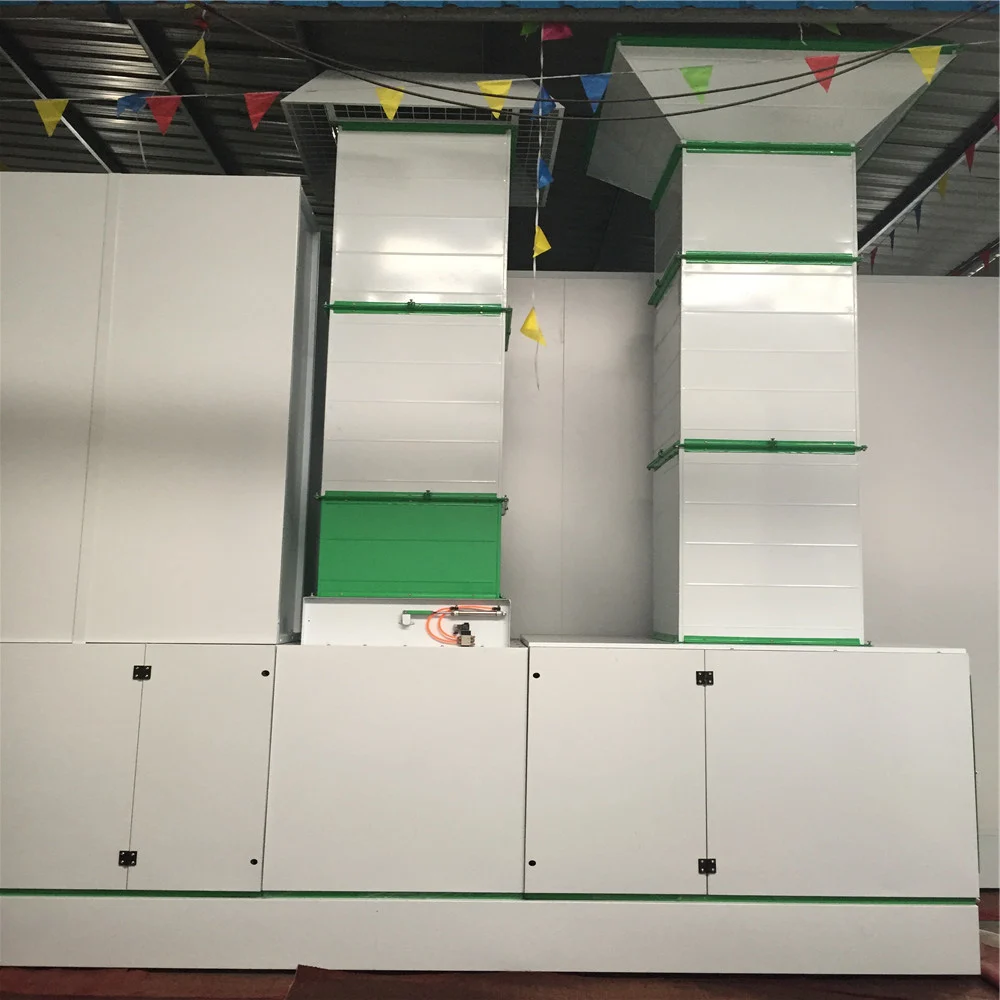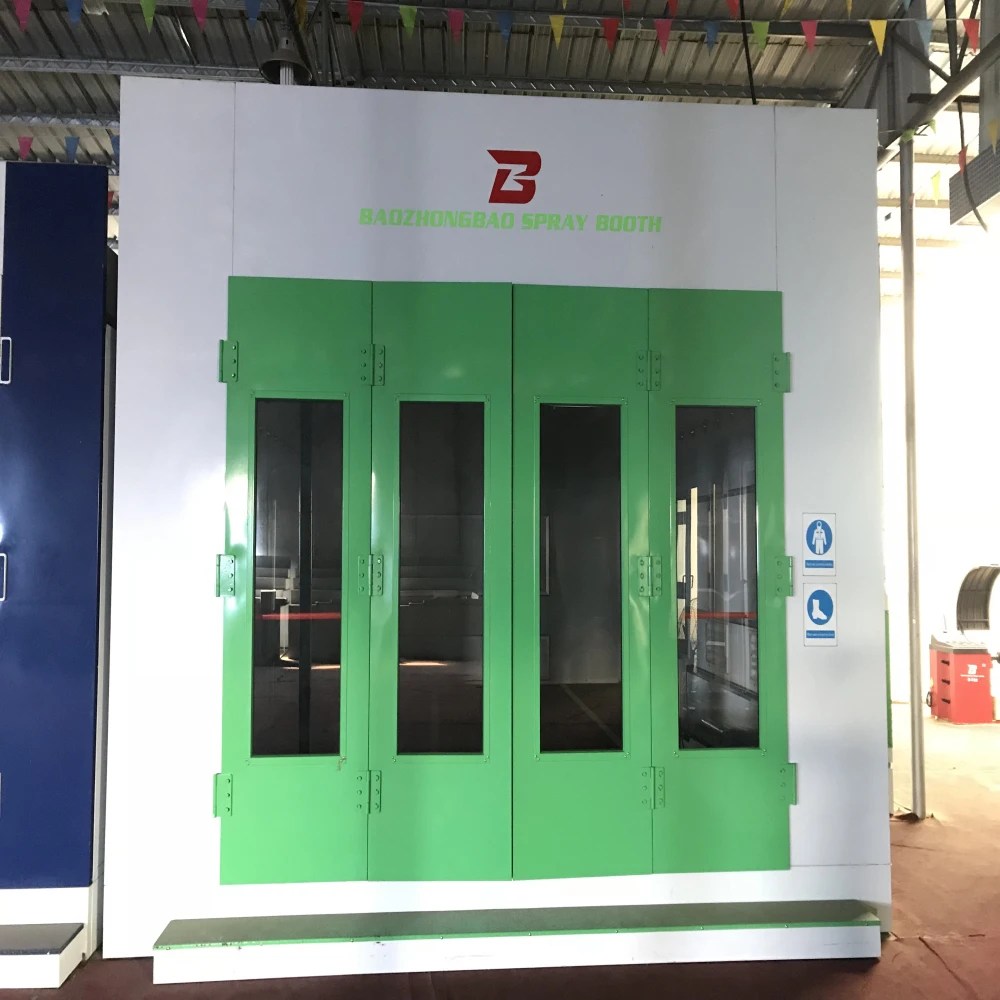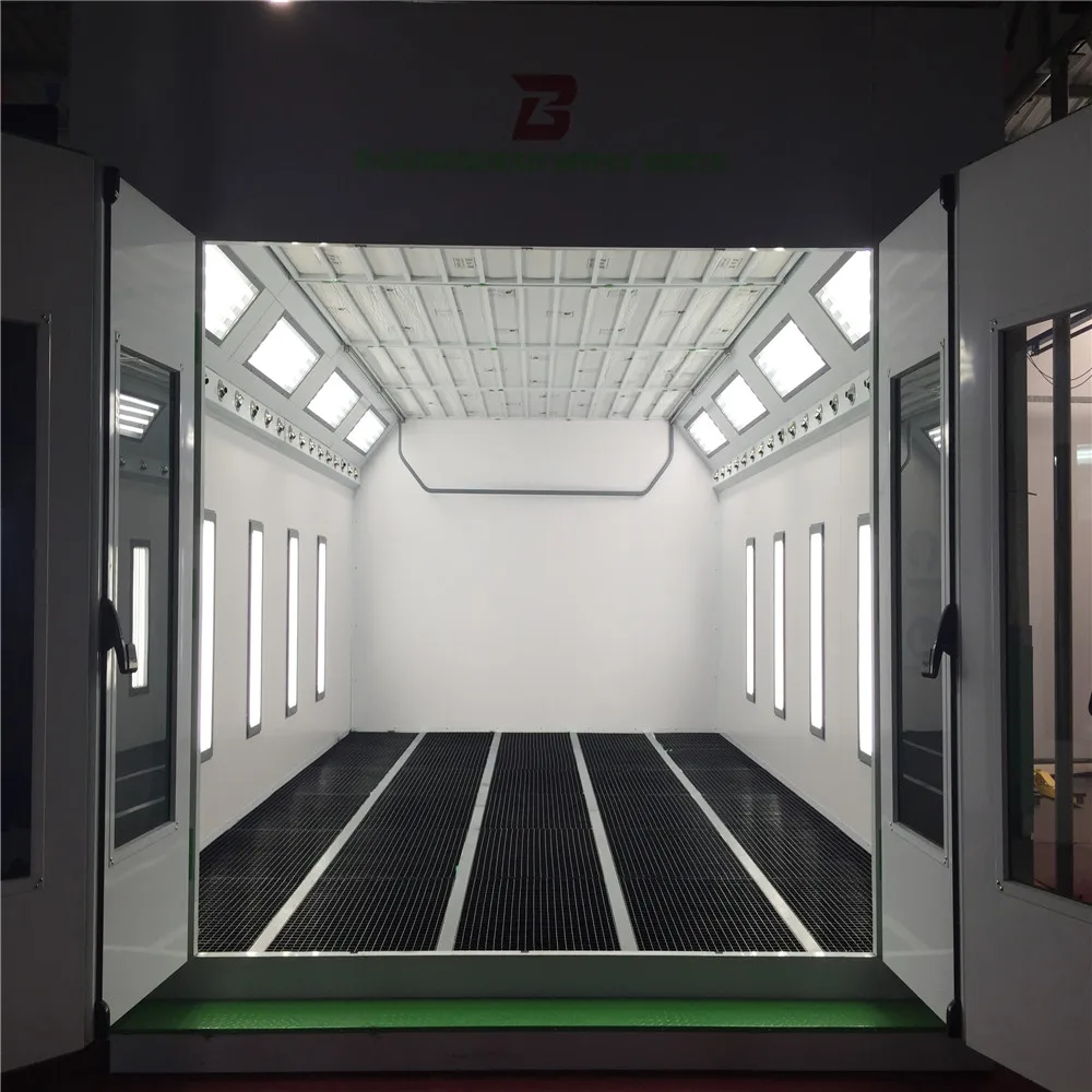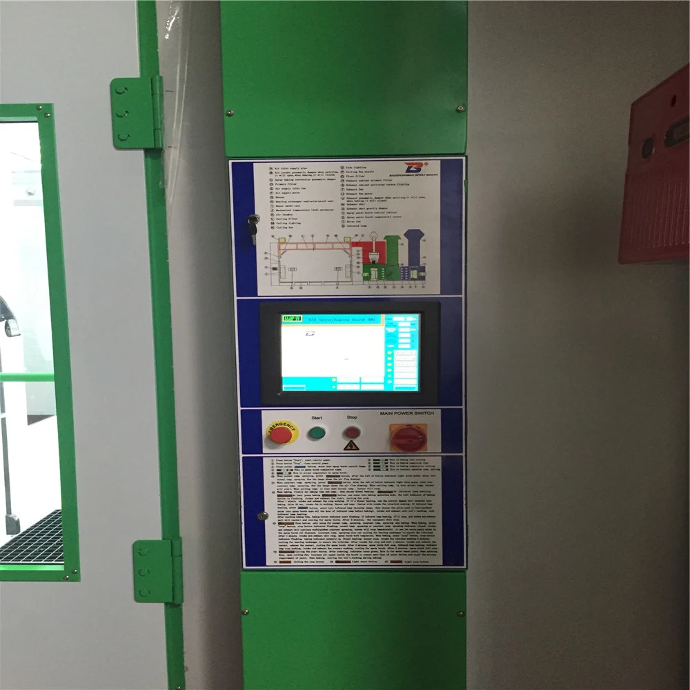 Features: Cabin System | Wallboard | EPS (epispastics polystyrene)Colorful Steel Skin Boards,50mm Thick, Tongue & Groove Style,Compound Construction, Anti-flame and Heat-Insulation Galvanized Roof Panel | | | | | | Basement | Galvanized Steel Sheet and Square Steel Pipe assembling, Two Rows Grid & Three Embossed Plate | | | | Ramp | Two Ramps, Embossed Steel Plates. | | Air Intake and Exhaust System | Inhaling Ventilator | Model: YDW 4.5L1 | Exhaust Ventilator | Model: YDW 5.6S | | Blower capacity: 12500m3/h | Blower capacity:20000m3/h | | Pressure: 800Pa | Pressure: 810Pa | | Rolling speed: 900rpm | Rolling speed: 900rpm | | Power: 4kw | Power: 7.5kw | | Quantity: 2 sets | Quantity: 1set | | Air Volume: 24000m3/h; Air Speed: 0.35m/s | | Air Purification System | Dual Filtering Structure, The Primay Filter Can Capture Granules Larger than 10 μm. Ceiling Filter Capture Granules Bigger than 5μm. The Whole Purification System Has Capacity of Large Volume of Dust. Its Filtering Rate Reaches 98%. | | | | | | Heating System | Burner | Italy Riello Brand,G20 Diesel Burner, 180000Kcal/h, 10N Damp Motor | | Heat Energy Converter | Stainless Steel, Argon Arc Welding, The Heat Exchange Rate 85% | | Max Temp:80.C, Heating Time:5-7min(20-60), Fuel Consumption: 4-5kg/vehicle | | Light System | Ceiling Light: 24 pcs 36w Philips Lamp; Bottom Light: 16 pcs 36w Philips Lamp, 900 Lux | |