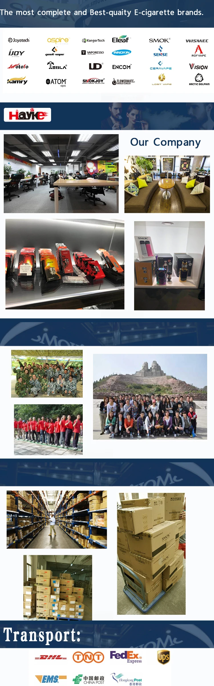 - Company Profile: SMOK_HaykeVape is the biggest franchised agent for great E-cigarettes in China. At present, our company represents brands including Uwell, Joyetech, Kangertech, Aspire, Ismoka Eleaf, Smok, Vaporesso, Innokin, Geekvape, IJOY, Sense, UD etc. We are always trying to build up a super strong e-cigarette market with the most complete and the best quality brands for wholesales and retailers from all over the world.