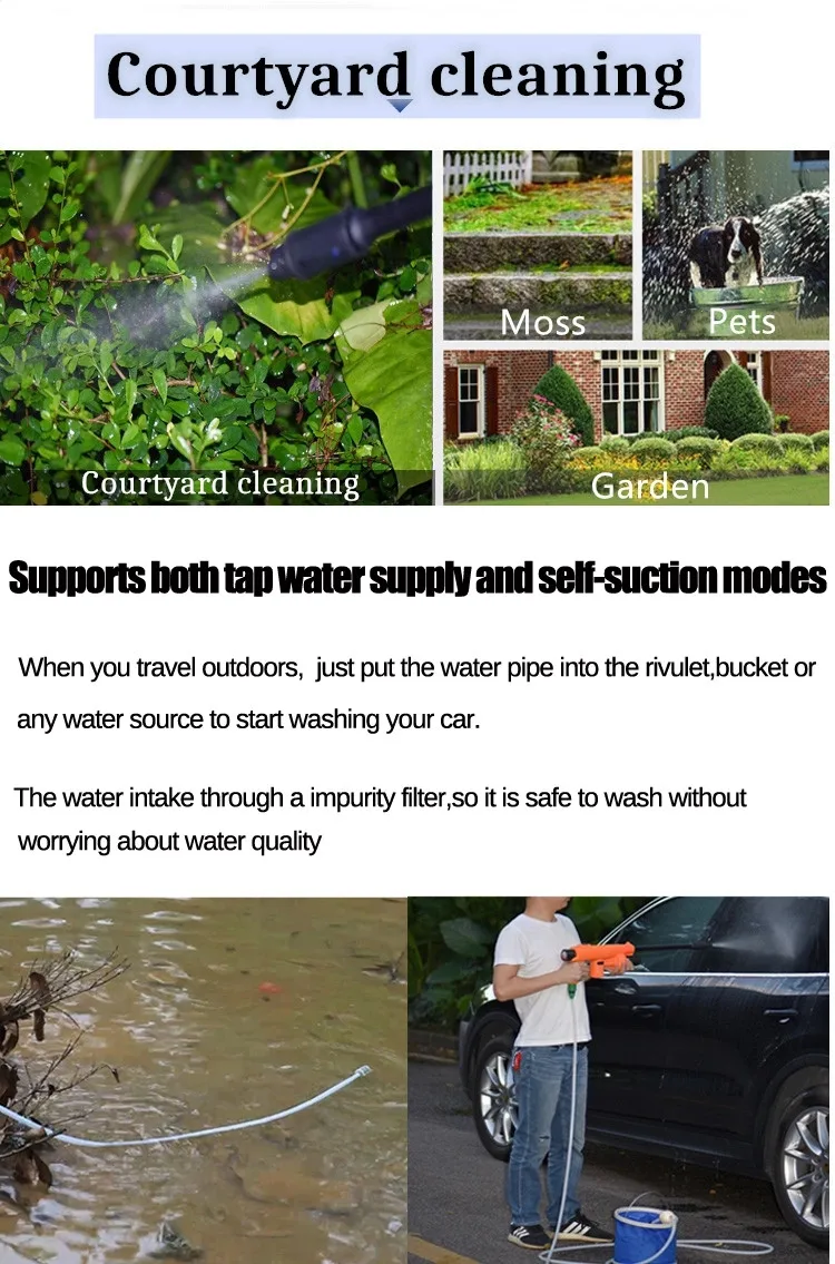 2.Supports both tap water supply and self-suction modes.(when you travel outdoors,just put the water pipe into the rivulet,bucket or any water source to start washing.