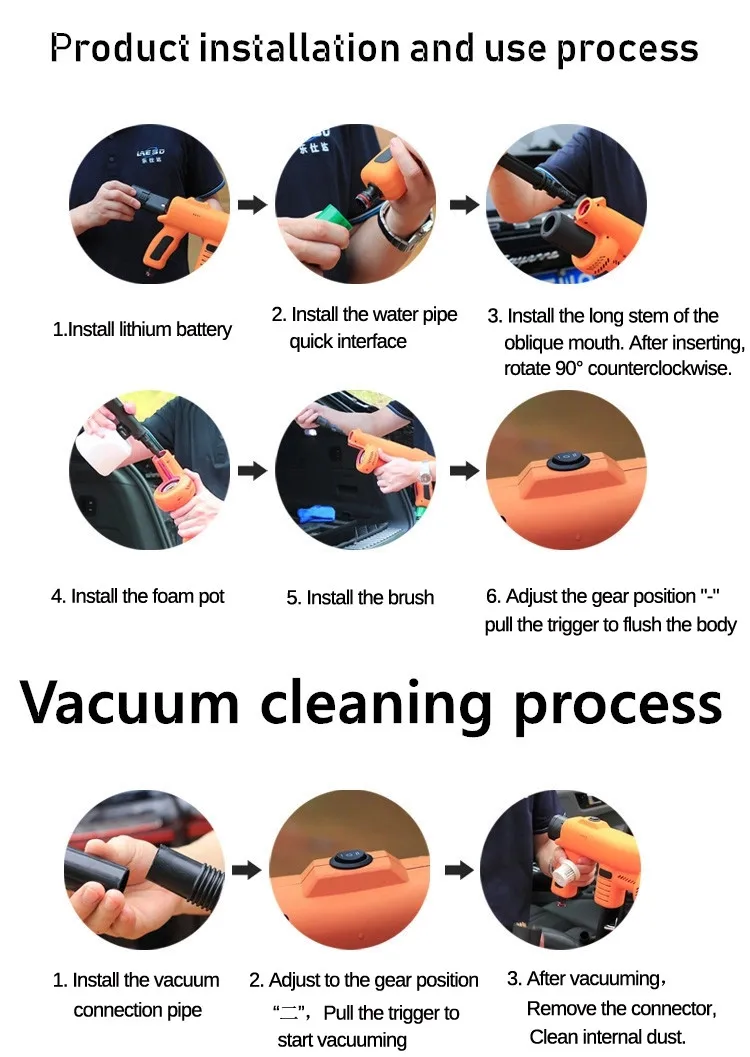 3.Comes with a 2000MAH lithium battery, without restriction of power cord, you can wash your car freely in 90 minutes.1.5kg only to take easily.