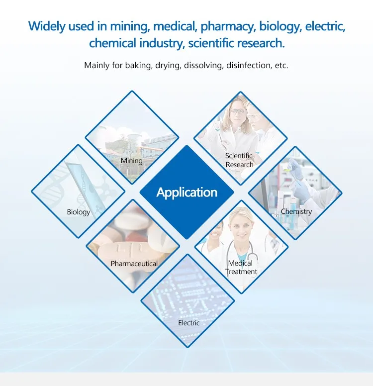 It is applicable to such tests as drying, cure melting, sterilizing in industrial and mining enterprises as well as in laboratory and scientific research institutes. Normally the oven is widely used in the fields of Electrics, Electronics, Instruments, Materials, Education, Medicine, chemical industry or other Scientific Research Organizations and Production Units.