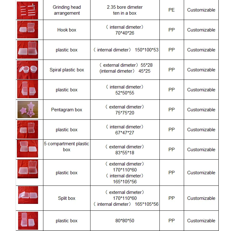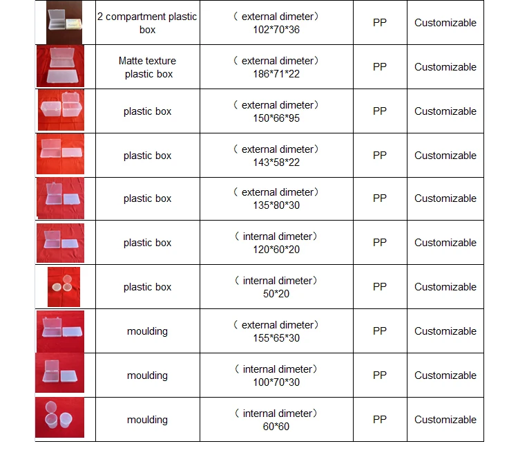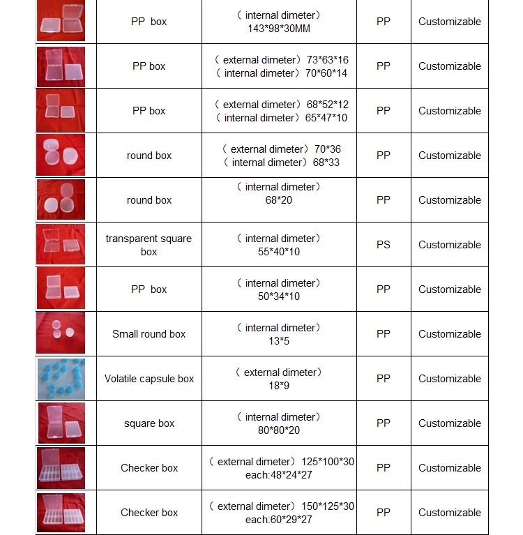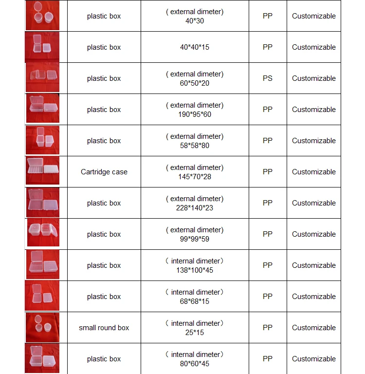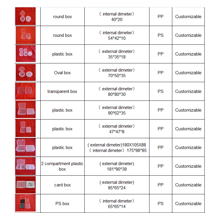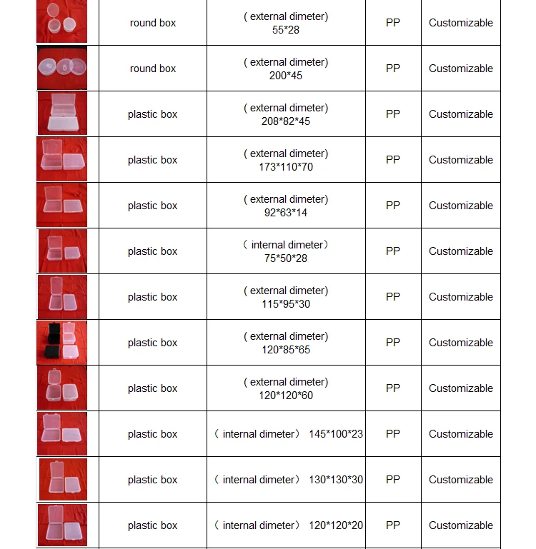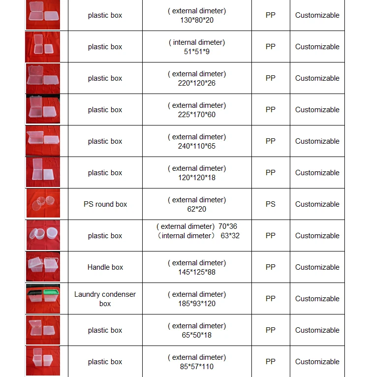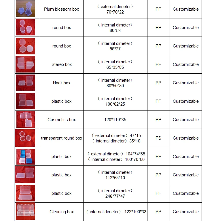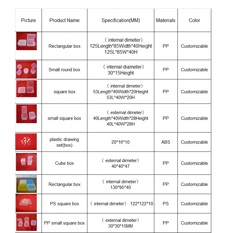 The factory specializes in producing plastic boxes and various plastic products,which can be customized according to drawings or samples. Our Products have passed Eu export testing standard. The existing specifications are as follows:
