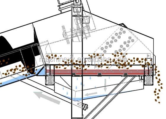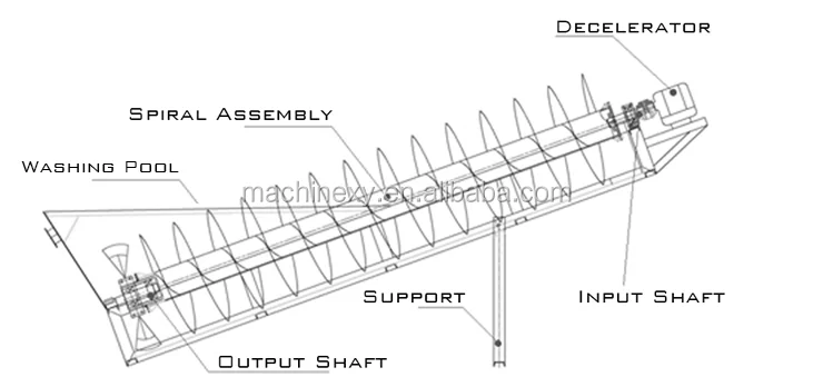 The electric motor runs slowly with the impellor after decelerated by the belt, decelerator and gears wheel. The sand and stone flow into washing launder from feeding launder, rolls with the impellor, and grinds each other. The impurity covering the sand is washing away. At the same time, add more water, the strong water flow will take away waste and some low-weight wastes from washing launder. Through the above process, the washing function is finished. The clean sand and stone is lift up by vane. When it goes up slowly, the water begins to drop through the mesh and fall back in the washing launder.