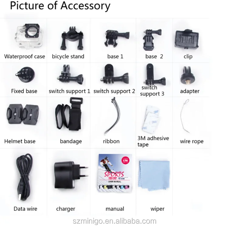 15.Accessories:Waterproof case, Waterproof case bracket,Waterproof case clip,bike bracket,multifunction clip, camera clip,helmet seat, bandges cleaning cloth, power adapter, 3M stickers, USB cable, bracket adapter, manual.