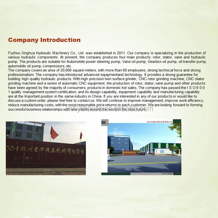 We mainly manufacture new aftermarket hydraulic pump( vane pumps, gear pumps, piston pumps), hydraulic parts (vane for auto power steering pump, vane for vane pump etc, Rotor , Stator and Cartridge kit, Repair kit etc). For more details, please visit PRODUCTS