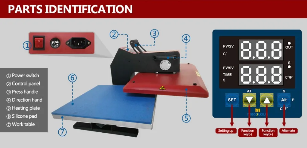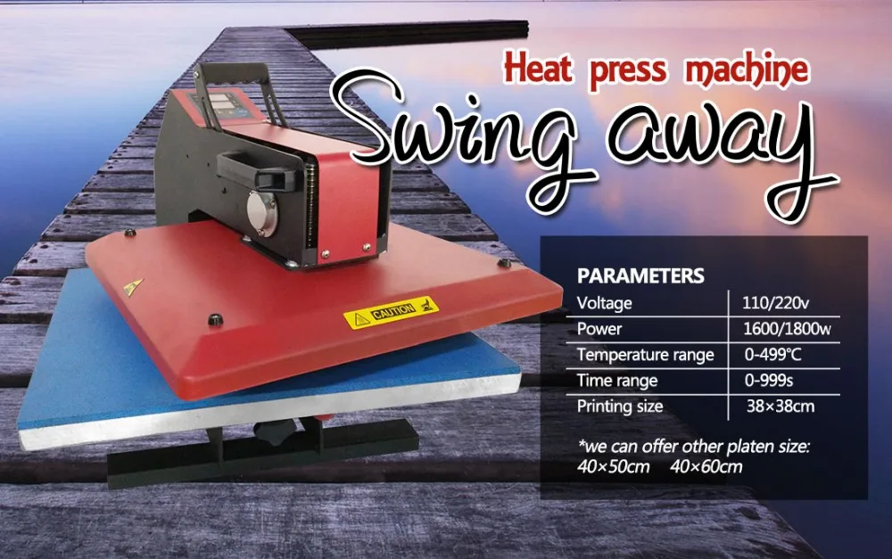 The heat press is a machine designed to imprint a design or graphic on fabric, such as T-shirts,cap,plate,etc.swing Away/Arm 15" x 15" heat press machine.15" x 15" heating surface.Swing all the way around.Teflon coated heat surface.